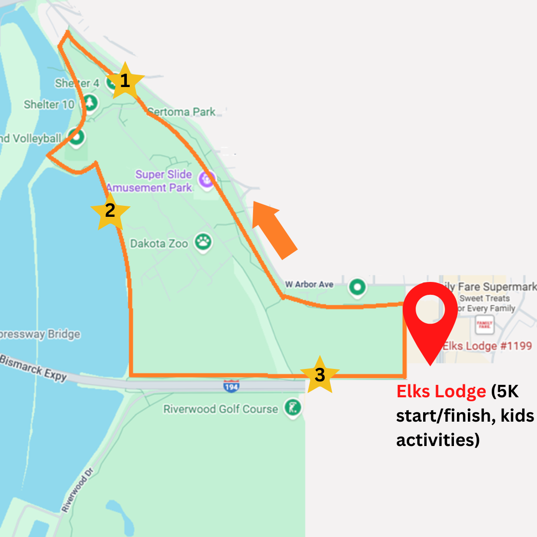 Here is a map of the 5K course. All other activities will take place outside of the Sertoma Community Center (next to the Superslide Amusement Park).